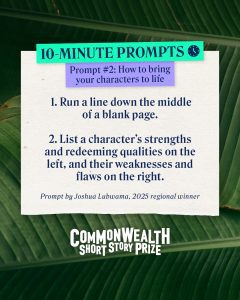 Whether you’re preparing an entry for the Commonwealth Short Story Prize or simply looking for creative writing inspiration, these prompts will help you get started.